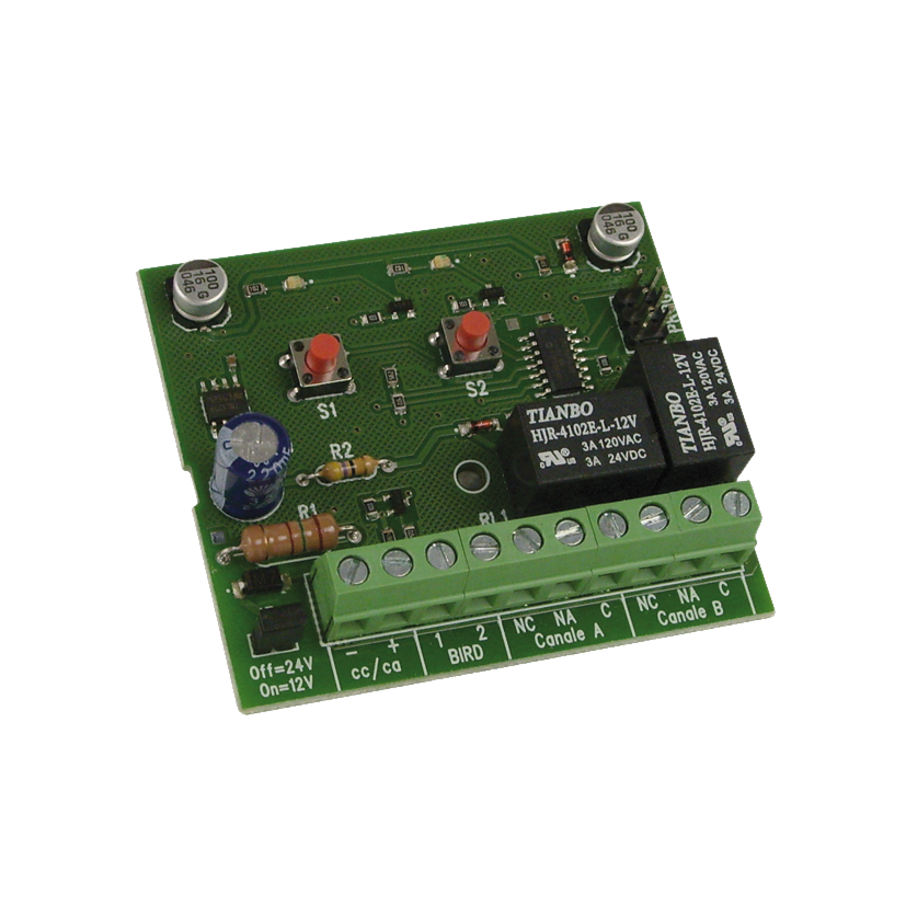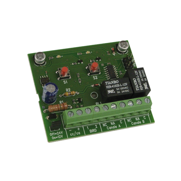 Codice a 12 bit indipendenti per i due canali con autoapprendimento, Ricezione su entrambi i canali A e B, Uscite a relè, Funzionamento: monostabile. Combinazione di codici possibili:4096.Tensione nominale di alimentazione:12/24Vcc/ca ±5%.Assorbimento massimo.Assorbimento in st/by con BIRD collegato: 22mA @ 12Vcc. Uscita relè: 2 C/NA/NC 1A. Dimensioni (L): 77mm. Dimensioni (A): 67mm