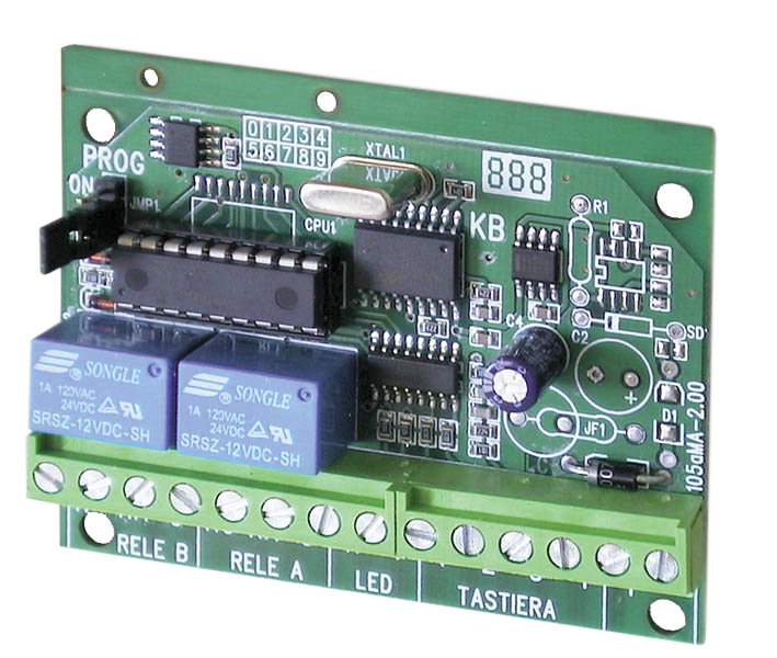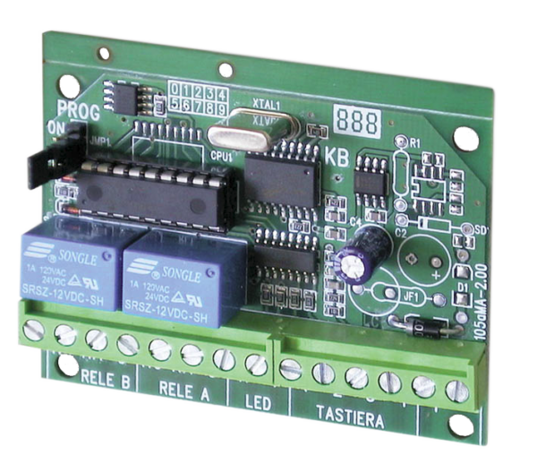 Utilizzabile in abbinamento alla KBC, KBM, KBT o KBSS per inserimento/disinserimento impianti d’allarme, controllo accessi, etc. Ingressi per controllo LED della tastiera Conforme alla norma CEI EN 50131-1 Codici operatore programmabili: 2 da 1÷6 cifre. Funzionamento: monostabile bistabile e combinato. Collegamento con tastiere supplementari: tramite 4 fili. Sistema di trasmissione dati: DTMF. Numero massimo di tastiere collegabili: 4. Canali di uscita: 2. Grado di sicurezza: 1. Classe ambientale: 2. Tensione nominale di alimentazione: 24Vcc ±5%. Assorbimento normale: 50mA. Uscita relè: 2 C/NA/NC 1A. Dimensioni (L): 90mm. Dimensioni (A): 70mm.