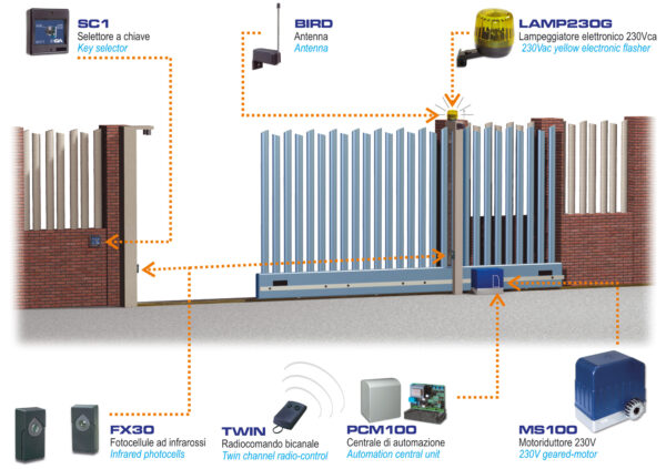 Kit per cancello scorrevole con centrale PCM100 +FX40D +BIRD + TWIN +LAMP230G +TRG (motore non incluso)