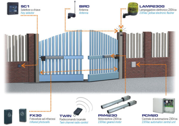 Kit per cancello ad ante con centrale PCM20 +DEC20 +2pz FX40D +BIRD +TWIN +LAMP230G +TRG (motore non incluso)