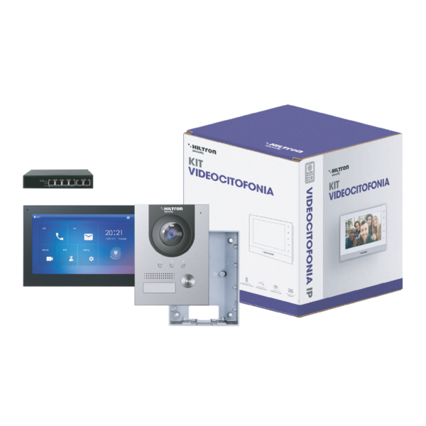 Kit videocitofonia IP monofamiliare con postazione esterna VIS2PE1 + postazione interna VIS7NPI + VIS1P +switch 4 porte THSW4P2T
