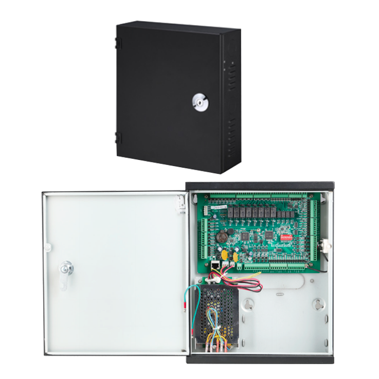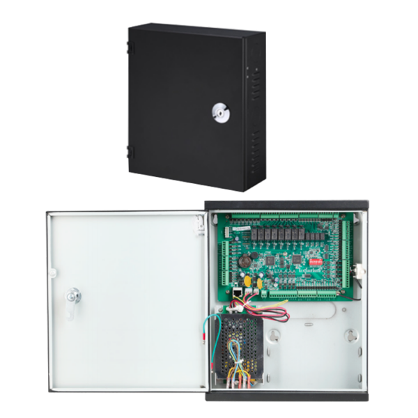 Centralina per controllo accessi a 8 varchi e singolo lettore, 1 porta LAN 100 Mbps, RS485 e Wiegand 26 (opzionale) / 34, 8 pulsanti aper- tura porta, 8 ingressi per sensore stato porta, 4 ingressi e 4 uscite allarme, 8 ingressi lettore, allarme apertura porta, intrusione, coercizione, tamper, 100000 tessere e 150000 eventi, alimentazione 100~240 Vac
