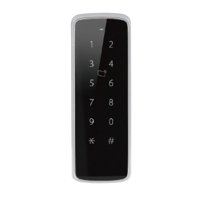 Lettore per il controllo accessi IP65, tessere Mifare da 13.56 MHz e password, RS485 e Wiegand 26 (opzionale) / 34, tamper, tastiera touch retroilluminata, alimentazione 5~16 Vdc