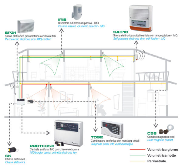 zona (se non ripristinata) dopo aver generato un allarmeTamper di protezione antistrappo: incluso. LED di controllo: presenza rete,tempo di uscita,stato allarme,stato zone,memoria allarme,stato fusibile servizi. Zone di protezione immediate: 2. Zone di protezione ritardate: 1. Zone di protezione antisabotaggio “24h”: 1. Tensione nominale di alimentazione: 230V~ ±5% 50Hz. Tensione nominale in uscita servizi: 13Vcc ±5%. Assorbimento normale: 50mA. Assorbimento massimo: 140mA. Assorbimento massimo della sola centrale: 35mA. Corrente massima erogabile dall’alimentatore: 1A (TM35SW). Corrente massima erogabile in uscita sirene: 3A (con batteria collegata). Corrente massima erogabile in uscita servizi: 650mA. Alimentatore / caricabatteria: TM35SW (incluso). Batteria in tampone: 12V 7,5Ah (non inclusa). Durata allarme regolabile: 180 ÷ 600sec.. Grado protezione del contenitore: IP30. Fusibile sul primario del trasformatore: 250mA L 250V tipo F. Fusibile sul secondario del trasformatore: 2A L 250V tipo F. Fusibile uscita sirene: 3,15A L 250V tipo F. Fusibile uscita alimentazione servizi: 1A L 250V tipo F. Uscite: attivazione sirena Ext/Int,positivo presente ad impianto inserito. Tempo di uscita regolabile: 0 ÷ 60 sec.. Tempo di entrata regolabile: 0 ÷ 60 sec.. Contenitore: ABS. Temperatura di funzionamento: +5°C ÷ +40°C. Dimensioni (L): 280mm. Dimensioni (A): 230mm. Dimensioni (P): 95mm.
