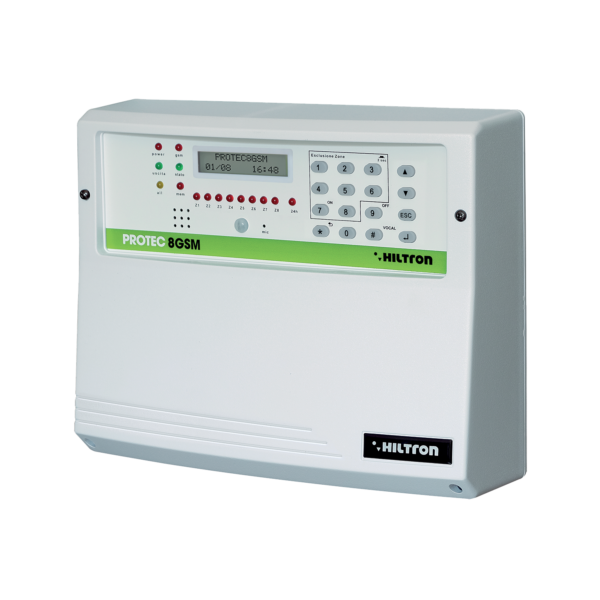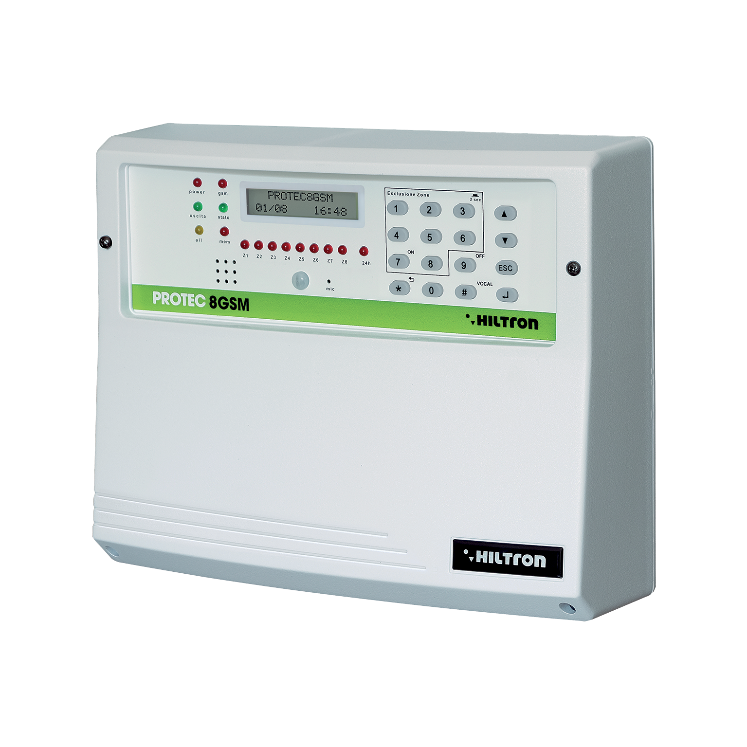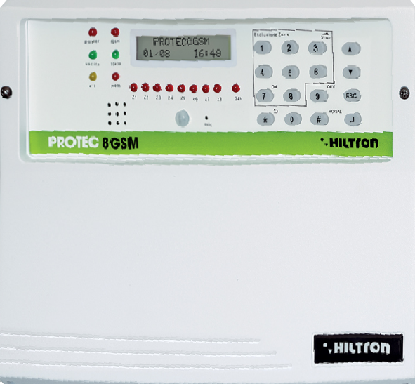 da tastiera locale o remota con indicazioni sul display, Esclusione zone e 24H sia da pannello che da remotoDisplay LCD e tastiera con retroilluminazione bianca, Tamper di protezione antiapertura Indicazione su display del gestore telefonico e intensità segnale GSM, Manutenzione semplificata tramite cavo di interconnessione delle schede, Parzializzazione impianto programmabile, Nuovo sistema EASY CONNECT per semplificare l’installazione, Avviso telefonico preregistrato di allarme con indicazione stato impianto, stato zone, stato alimentazione e memoria allarme vocali pre-registrati per stato presenza rete , stato antifurtoImpianti parzializzabili (da consolle, remoto o chiave)Messaggi SMS pre- impostati per stato impianto, presenza rete, identificativo zona in allarme. Tamper di protezione antistrappo: incluso. Grado d protezione: IP30. Grado di sicurezza: 1. Segnalazione evento: assenza rete prolungata. Classe ambientale: 2. Zone di protezione: 8 (6 immediate + 2 ritardate). Tensione nominale di alimentazione: 12V. Rubrica: 16 numeri. Intervallo di trasmissione allarme: identificativo zone, autoesclusione da remoto. Vano per batteria: (Batteria consigliata 12V7,5Ah). Modulo GSM: Quadriband. Contenitore: ABS. Temperatura di funzionamento: +5°C ÷ +45°C. Dimensioni (L): 280mm. Dimensioni (A): 230mm. Dimensioni (P): 96mm.