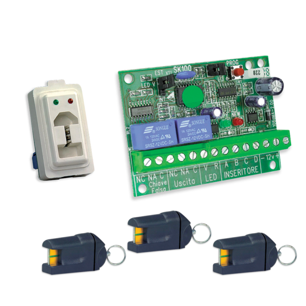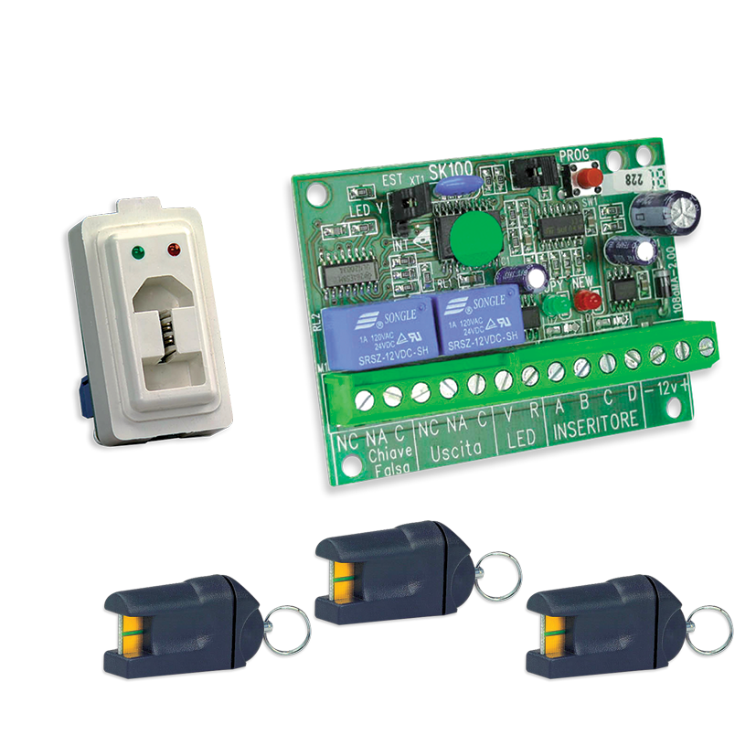 Conforme alla norma CEI EN 50131-1Scheda di controllo: 1x SK100. Inseritore: 1x SKI/M. Chiavi elettroniche: 3x SK. Grado di protezione: 1. Classe ambientale: 2
