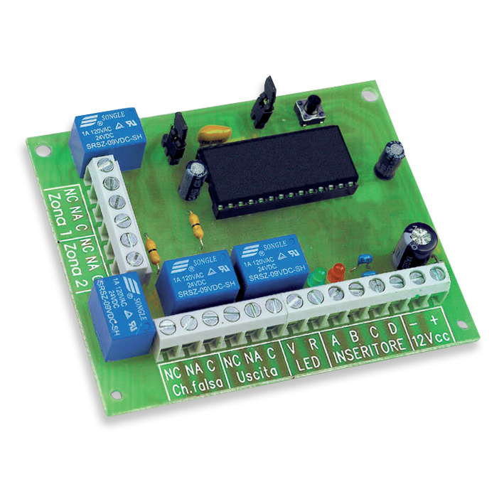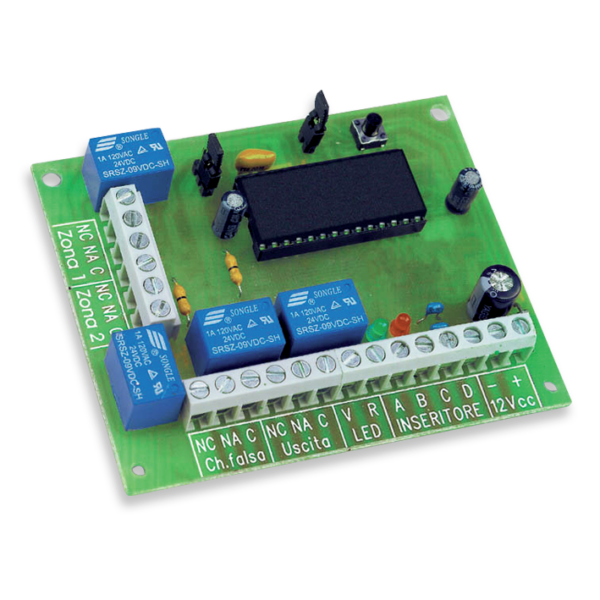 Codifica delle chiavi semplificata Generazione RANDOM del codice Relé ausiliario per riconoscimento chiave falsa Controllo esterno dei LED dell’inseritore, Conforme alla norma CEI EN 50131-1Funzionamento: monostabile o bistabile. Relè attivati ciclicamente tramite l’inserimento prolungato della chiave, per l’esclusione di due zone a scelta: 2. Grado di sicurezza: 1. Classe ambientale: 2. Tensione nominale di alimentazione: 12Vcc ±10%. Assorbimento normale: 20mA. Assorbimento massimo: 80mA. Assorbimento minimo: 7mA. Distanza massima di funzionamento: 200mt. Portata dei contatti relè: 24V 1A. LED di segnalazione: 2. Uscita relè: C/NC/NA. Dimensioni (L): 90mm. Dimensioni (A): 73mm.