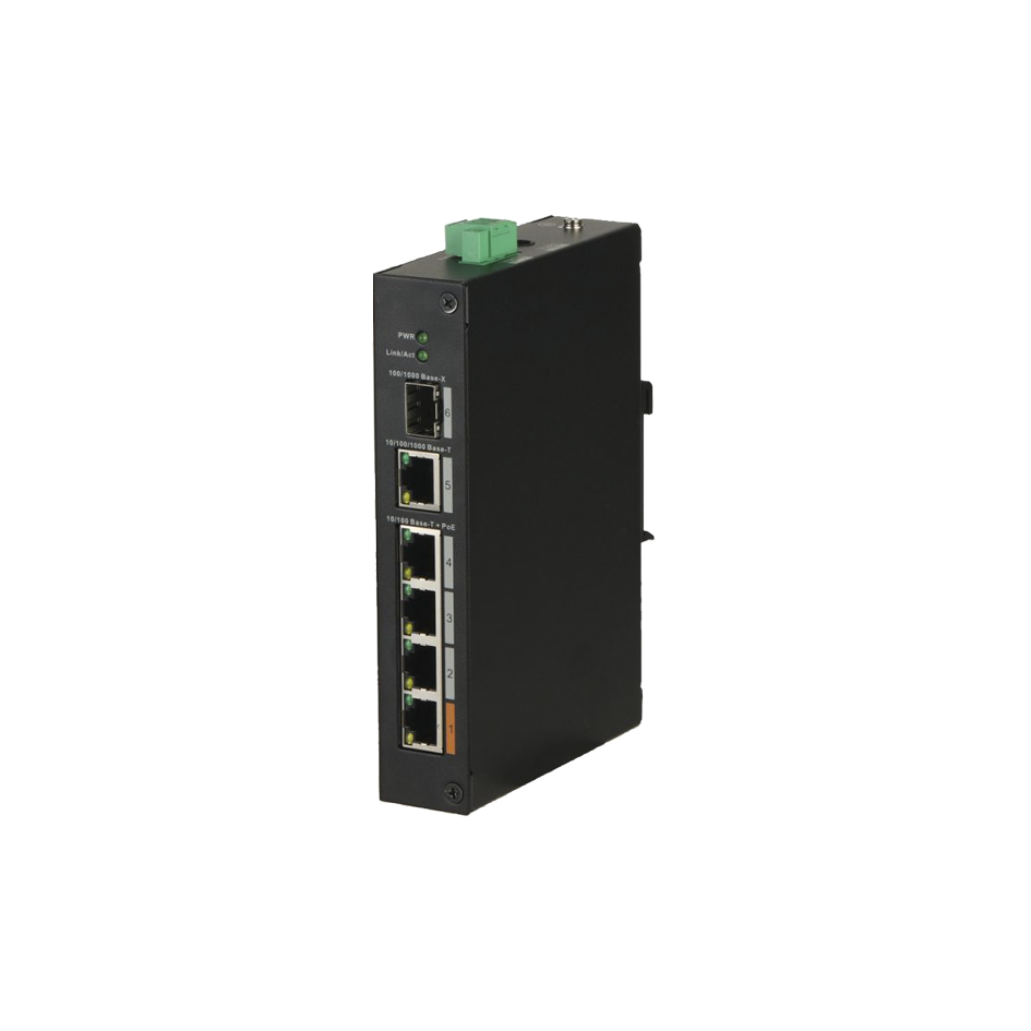 Switch 4 porte barra DIN RJ45 PoE 10/100 Base-T Power Badget 60W +1porta 10/10/1000 Base-X+1 porta 10/100/1000 Base-T prot. IEEE802.3at/af