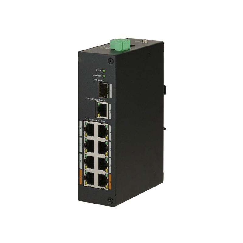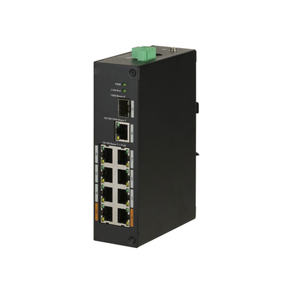 Switch DIN mount 10 porte totali di cui 1 non PoE GE, 1 non PoE SFP, 8 PoE+ FE, budget totale 96W, flow control, switching capacity 7.6Gbps, alimentazione 53 VDC