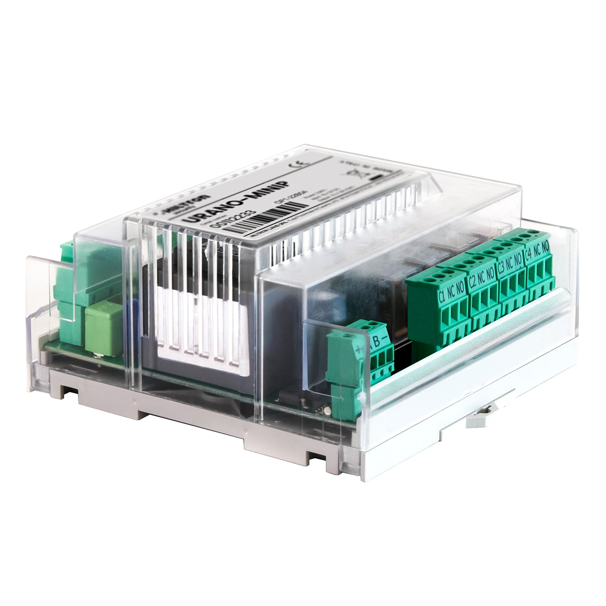 URANO-MINIP gestisce l’illuminazione, le tapparelle, elettropompe ed elettrovalvole (riscaldamento, irrigazione), comandi semplici ed elettronici, sensori di presenza, crepuscolari, vento, pioggia, funzioni temporizzate personalizzabili e misurazione dei carichi collegati. URANO-MINIP dispone di 8 ingressi digitali, 4 uscite a relè, alimentazione da rete 230V~ e porta RS-485 di comunicazione e programmazione attraverso il software CIBELE.