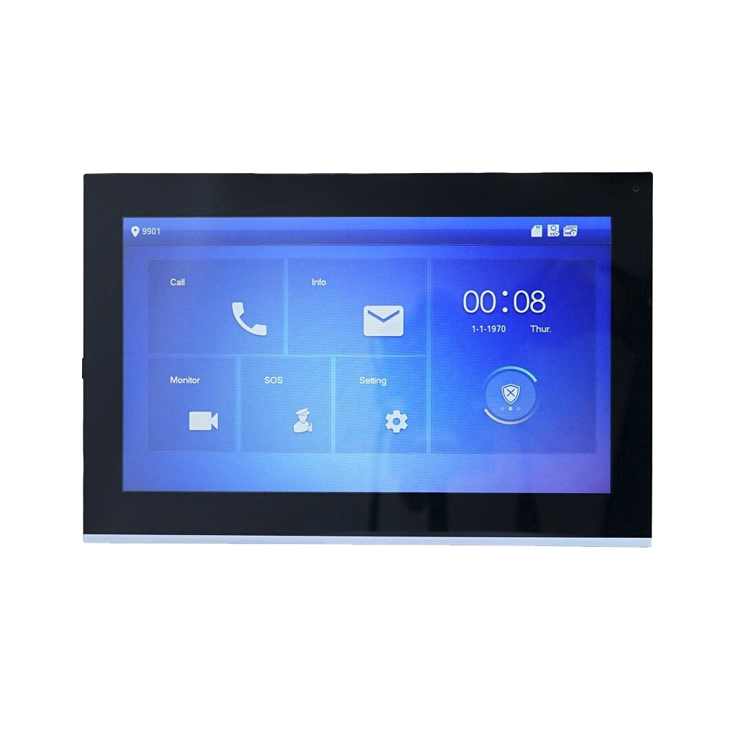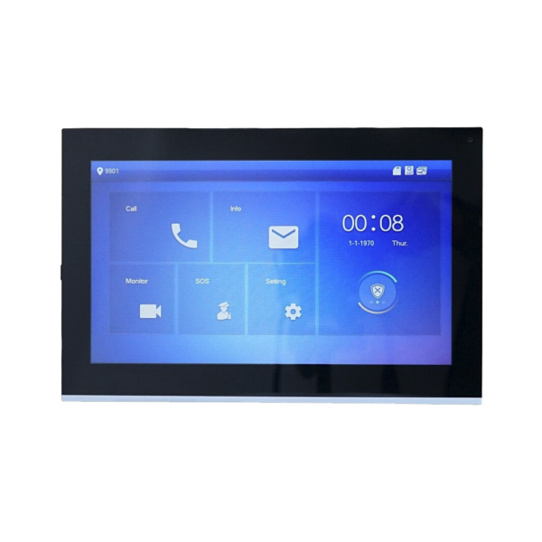 Postazione interna LCD 10″ touch screen, LAN, 6/1 I/O alarm, intercomunica con altre PE, 12Vdc/PoE <7W