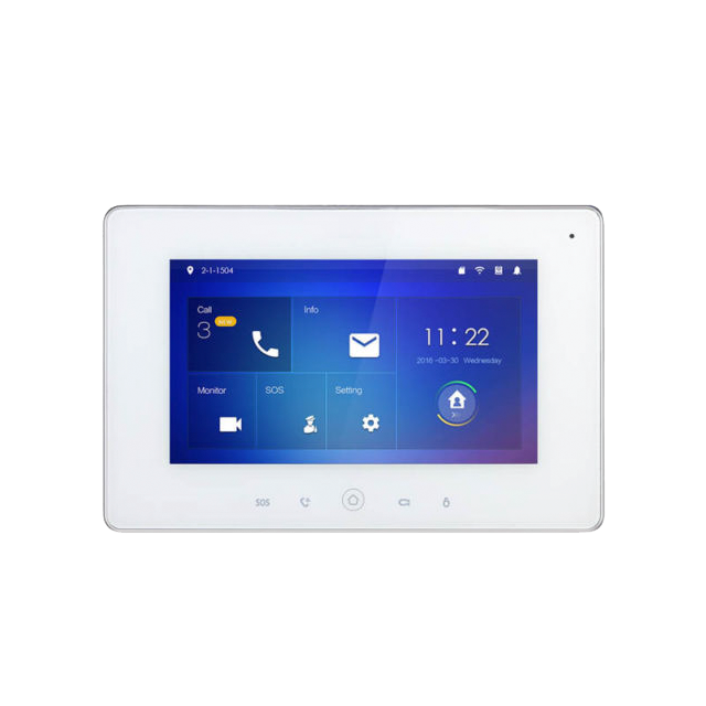Postazione interna 7″ touch Wi-fi, colore bianco, risoluz. 1024×600, SD card, 6/1 IO alarm, 12Vdc/PoE <7W